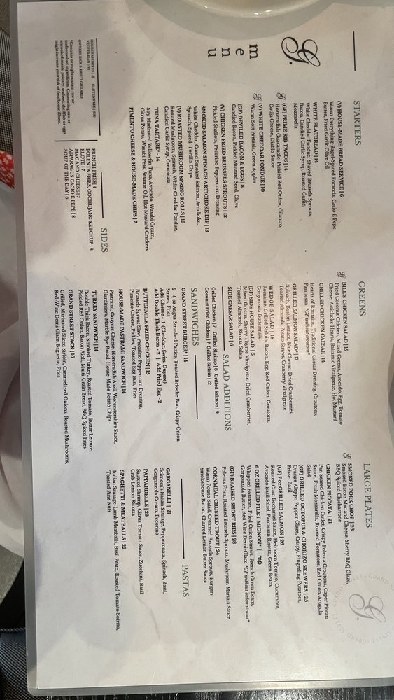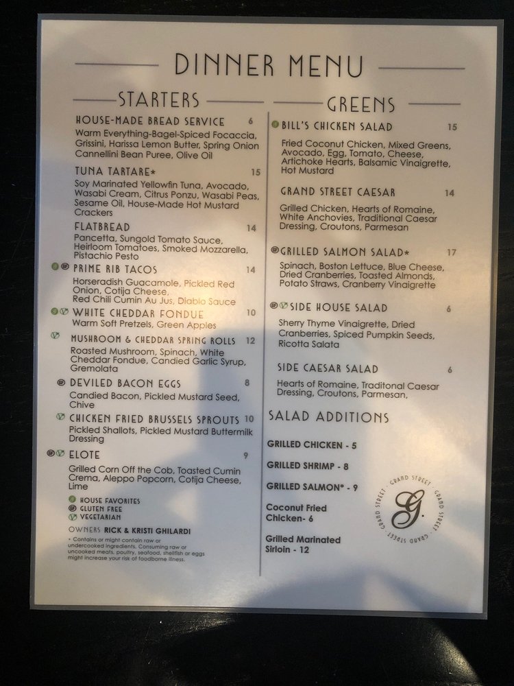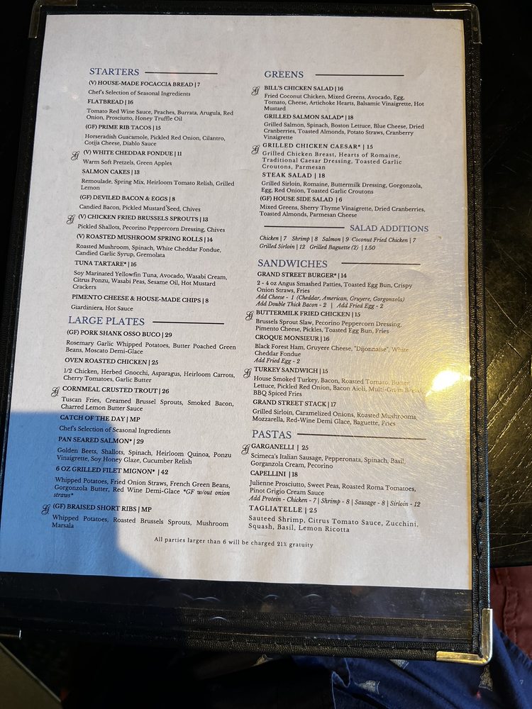 "Grand Street Cafe, located in Kansas City, offers a versatile menu with options for every palate. From elegant large plates like the Grilled Filet Mignon and Braised Short Ribs to refreshing salads like Bill's Chicken Salad and Grilled Chicken Caesar, there is something for everyone to enjoy. The starters, such as Chicken Fried Brussels Sprouts and Prime Rib Tacos, set the stage for a culinary journey that is both innovative and comforting. The restaurant's classy ambiance, accommodating services like catering and private dining, and the option for outdoor seating make it a go-to spot for a variety of occasions. With a keen focus on quality ingredients and creative flavor combinations, dining at Grand Street Cafe is a delightful experience that leaves a lasting impression."